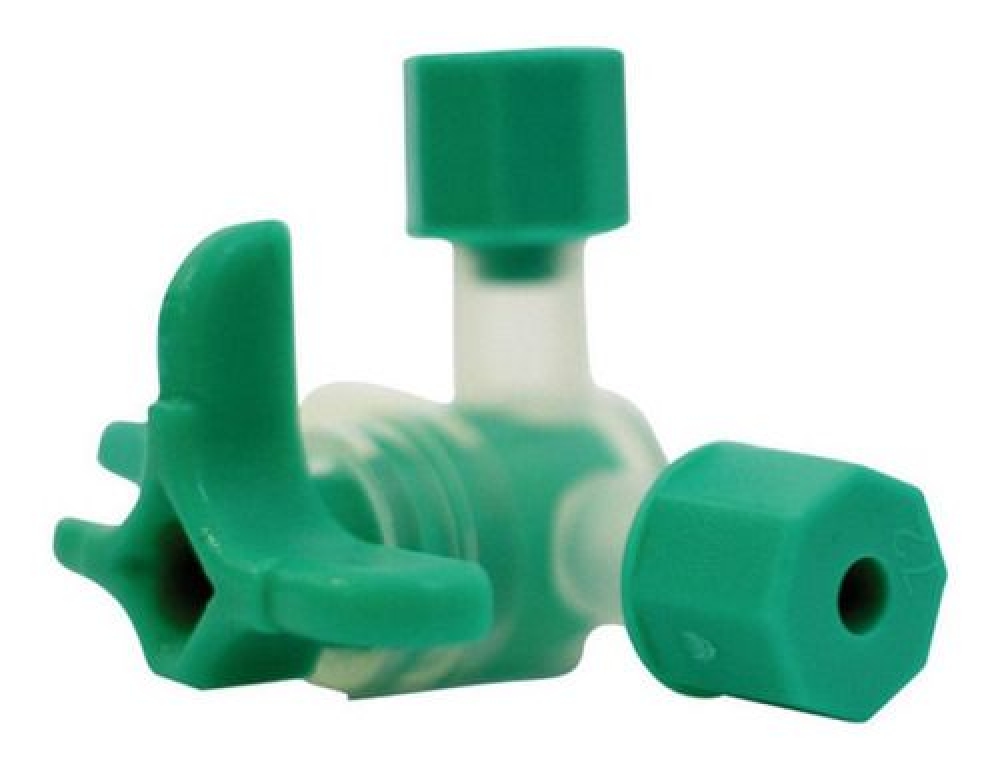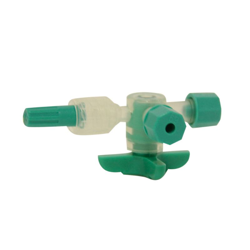 Conecta e controla o direcionamento de fluxo de soluções de três linhas distintas, duas linhas de infusão (equipo, extensor) e uma de acesso venoso (scalp, cateter) com conexão luer lock reversível (fêmea). Corpo transparente e chave colorida para direcionamento e oclusão de fluxo com movimentação suave.